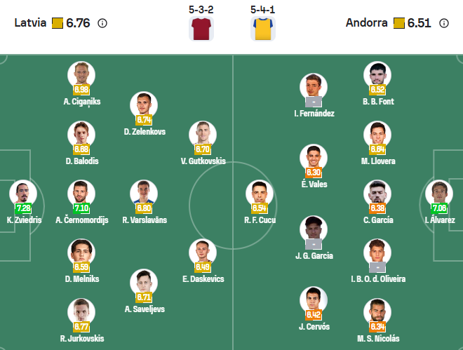 Sau thất bại 0-1 trước Albania ở lượt trận trước, Latvia đang rất quyết tâm giành trọn 3 điểm khi tiếp đón Andorra trên sân nhà. Thầy trò HLV Dainis Kazakevičs thể hiện nỗ lực đáng ghi nhận trong trận đấu đó nhưng thiếu sắc bén trong khâu dứt điểm, chỉ có 2 cú sút trúng đích dù kiểm soát bóng 38%.