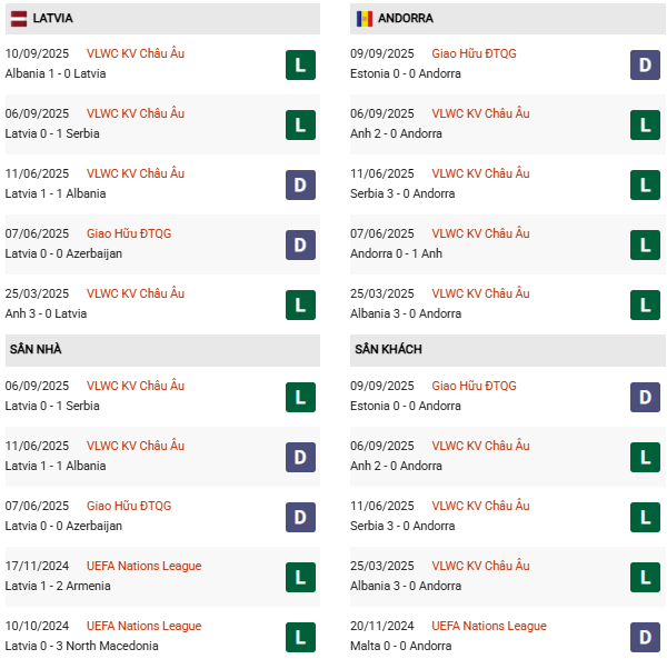- Trên sân nhà, Latvia thắng 2, hòa 2 trước Andorra.