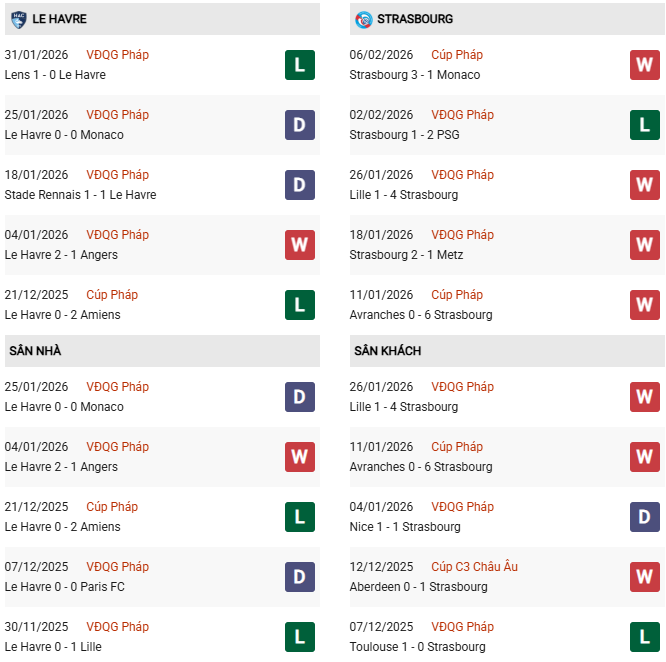 - Le Havre thắng 3, hòa 1, thua 6 trong 10 trận gặp Strasbourg gần đây.