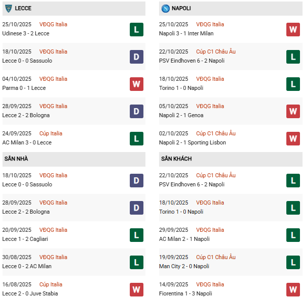 - Trên sân nhà, Lecce thắng 1, thua 5 trước Napoli.