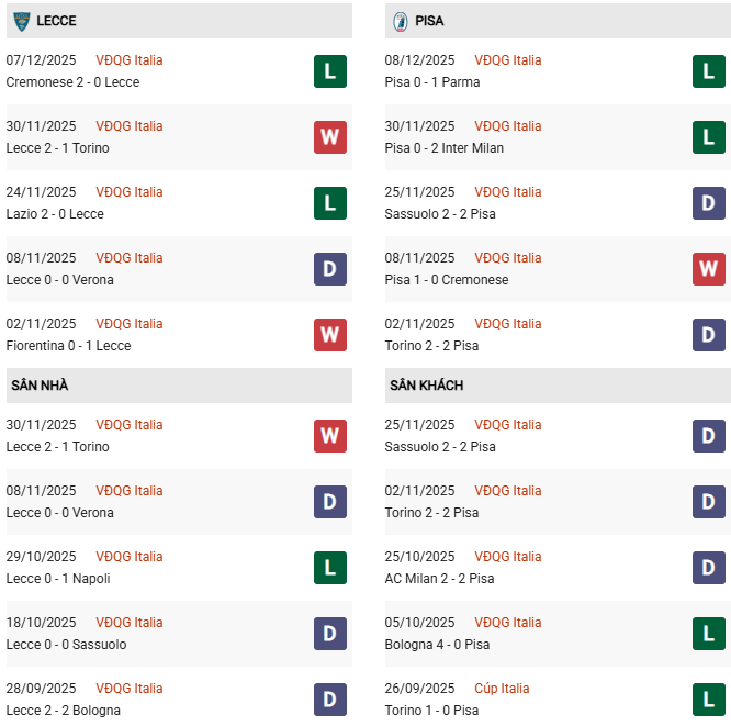 - Lecce thắng 5, hòa 2, thua 3 trong 10 trận gặp Pisa gần đây.