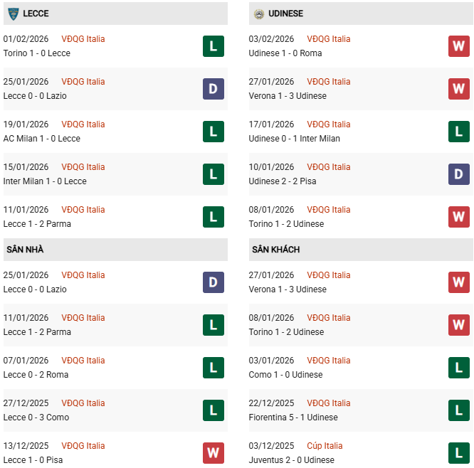 Thống kê cho thấy, 5/6 trận gần nhất của Lecce khép lại với việc ít nhất một đội không ghi bàn. Hàng công thi đấu thiếu sắc bén đang là bài toán lớn với đội chủ sân Via del Mare. Đáng chú ý, Lecce cũng chưa thắng trên sân nhà ở 4 vòng đấu gần nhất tại Serie A, đồng thời không thể đánh bại Udinese trong 5 lần đối đầu gần đây ở giải đấu.