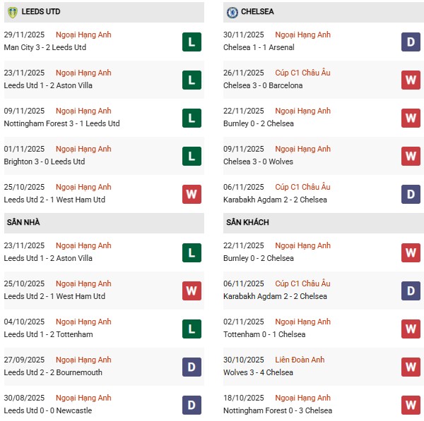 - Trên sân nhà, Leeds thắng 1, thua 2 trước Chelsea.