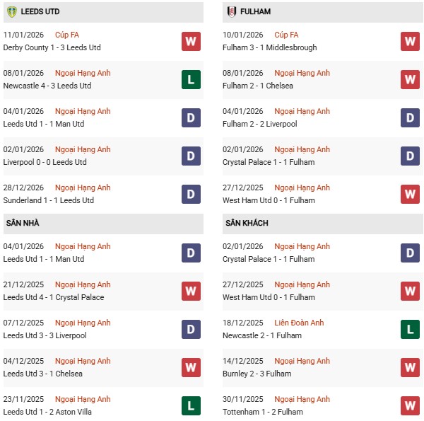 Hơn nữa, 4 trận gần nhất gặp nhau, Fulham đều đánh bại Leeds. Rộng hơn, 5 lần so tài gần đây với Fulham, Leeds chỉ kiếm được có 1 trận hòa, còn lại là thua 4 (chỉ tính trong 90 phút). Với tình hình hiện tại, Leeds khó tránh được thất bại thứ 5 liên tiếp trước đối thủ.