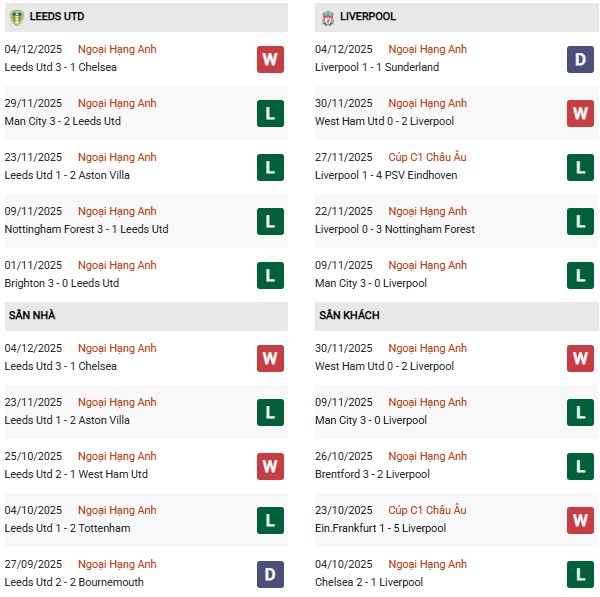 - Trên sân nhà, Leeds hòa 2, thua 4 trước Liverpool.