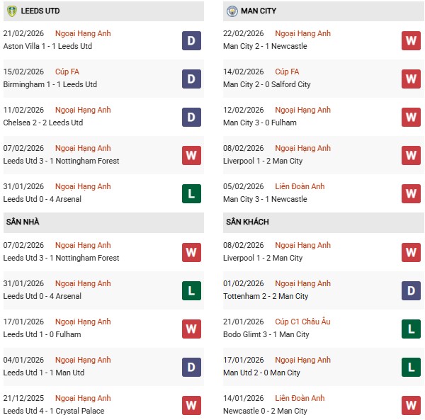 Thống kê phong độ Leeds vs Man City: