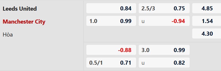 Thông tin tỷ lệ kèo bóng đá Leeds vs Man City: