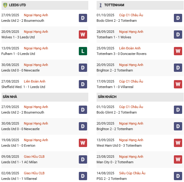 Leeds sẽ hướng tới mục tiêu kéo dài thành tích bất bại trên sân nhà kể từ thời điểm họ trở lại giải Ngoại hạng Anh (mùa 2025/26), khi tiếp đón Tottenham tại Elland Road. The Whites đã thắng 1 và hòa 2 trong 3 trận đấu trên sân nhà, đồng thời họ cũng đang sở hữu thành tích bất bại trong hai trận đấu ở Ngoại hạng Anh gần nhất.