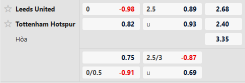 Tỷ lệ kèo hòa được thua xuất hiện ở trận đấu này. Mặc dù bị đánh giá yếu hơn đối thủ về thực lực cũng như lịch sử đối đầu gần đây, nhưng màn thể hiện xuất sắc kể từ khi thăng hạng Ngoại hạng Anh cùng ưu thế sân nhà sẽ giúp Leeds đủ khả năng tìm kiếm ít nhất 1 điểm trước Tottenham.