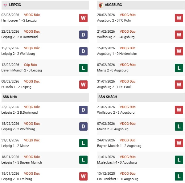 - Trên sân nhà, Leipzig thắng 8, thua 1 trước Augsburg.