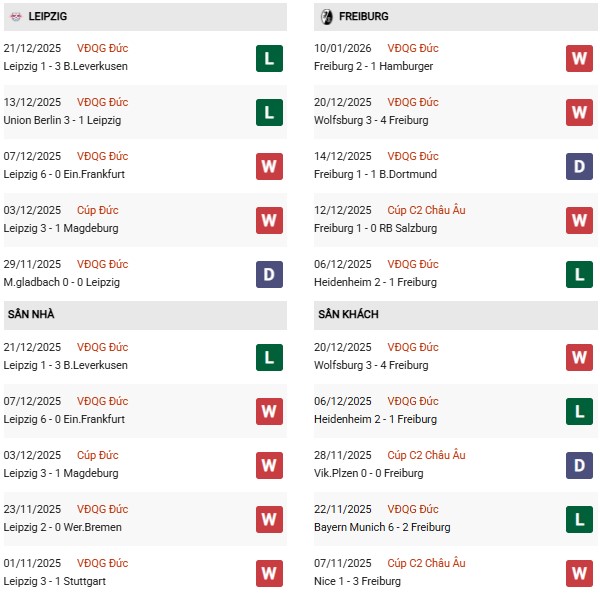 Xét về phong độ, Leipzig đang thể hiện bộ mặt khá tích cực với 6 chiến thắng, 1 trận hòa và chỉ thua 3 trong 10 trận gần nhất trên mọi đấu trường. Đặc biệt, sân nhà Red Bull Arena tiếp tục là điểm tựa rất lớn khi Leipzig thắng tới 7 và chỉ thua 3 trong 10 lần đón khách gần đây. Lối chơi tấn công tốc độ, khả năng pressing mạnh mẽ cùng hiệu suất ghi bàn cao giúp Leipzig thường xuyên tạo ra thế trận áp đảo trước các đối thủ, nhất là những đội bóng không quá mạnh khi thi đấu xa nhà như Freiburg.
