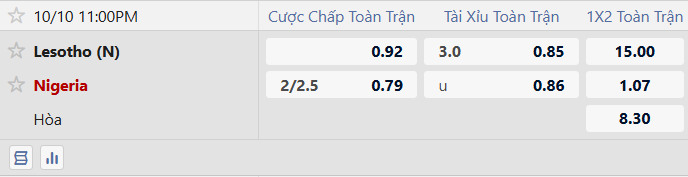 Nigeria được xếp cửa trên với tỷ lệ chấp 2 1/4 bàn. Đại bàng xanh đang có phong độ ổn định khi bất bại 3 trận gần nhất, trong khi Lesotho rơi vào chuỗi 4 thất bại liên tiếp. Thống kê đối đầu cũng ủng hộ đội khách: Nigeria chưa từng thua Lesotho trong 5 lần chạm trán gần đây, giành 4 chiến thắng. Nếu chơi đúng phong độ, thầy trò Eric Chelle hoàn toàn có thể tạo nên chiến thắng cách biệt từ 3 bàn trở lên.