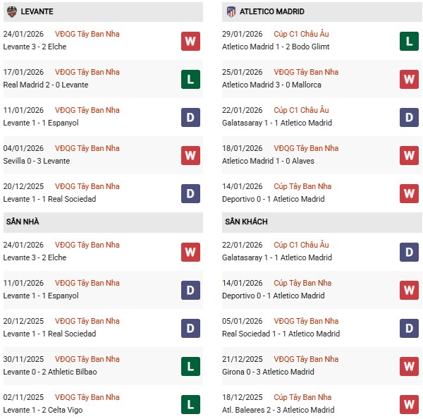 - Trên sân nhà, Levante thắng 2, thua 3 trước Atletico Madrid.