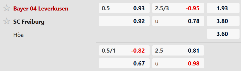 Sàn giao dịch châu Á ghi nhận mức kèo Leverkusen chấp 3/4 trái, tỷ lệ mà ở trận đấu sân nhà gần nhất xuất hiện, đội chủ sân BayArena đã đánh bại Union Berlin (2-0). Trận đối đầu gần nhất mà Leverkusen chấp kèo tương tự trận này họ cũng đã đánh bại Freiburg.