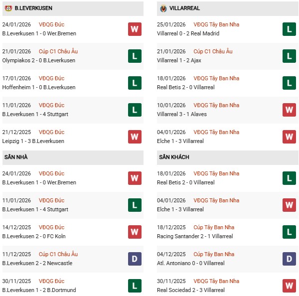 - Leverkusen hòa 1, thua 3 trong 4 trận gặp Villarreal gần đây.