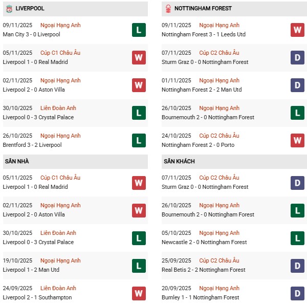 - Trên sân nhà, Liverpool thắng 2, thua 1 trước Nottingham.