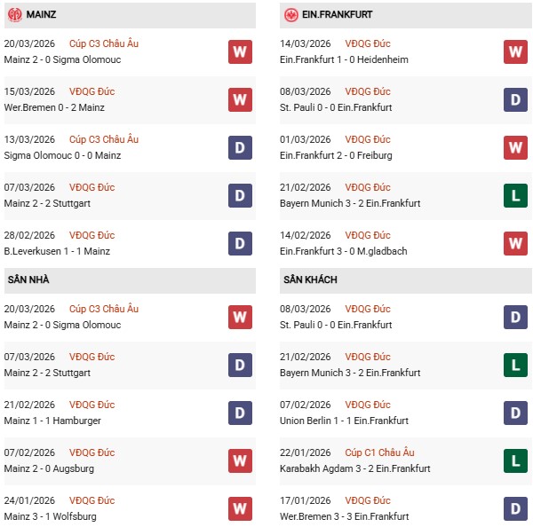 - Trên sân nhà, Mainz thắng 2, thua 2 trước Eintracht Frankfurt.