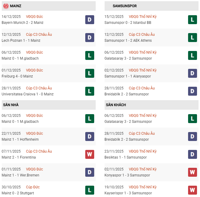 Samsunspor là hiện tượng của giải khi ghi tới 10 bàn – chỉ kém AEK Athens. Dù vừa thua AEK 1-2, họ vẫn nằm trong top 5 và có cơ hội lớn để giành vé trực tiếp vào vòng 1/8. HLV Thomas Reis rất hiểu Mainz khi từng nhiều lần đối đầu ở Bundesliga, và ông sẽ kỳ vọng các học trò chấm dứt chuỗi 6 trận không thắng gần đây.