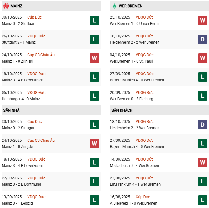 Về phía đội khách, Werder Bremen đang cho thấy sự ổn định đáng ngạc nhiên khi giữ vững vị trí ở nửa trên bảng xếp hạng (thứ 9). Dù chỉ hơn Mainz 7 điểm, nhưng vị thế của Bremen lại thoải mái hơn rất nhiều. Hàng công của họ hoạt động ở mức chấp nhận được với 12 bàn thắng sau 8 trận. Điểm đáng chú ý là cả hai đội đều có cùng số bàn thua là 16 sau 8 trận, cho thấy một sự lỏng lẻo đồng đều ở tuyến phòng ngự.