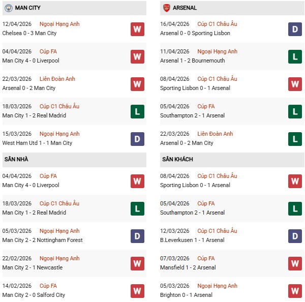 - Man City thắng 4, hòa 4, thua 2 trong 10 trận gặp Arsenal gần đây.