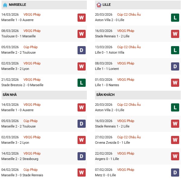 26 trận tiếp Lille tại thánh địa của mình, Marseille thắng tới 14, 9 hòa và 3 thua. Nếu chỉ lấy riêng 10 trận gần đây khi Lille làm khách ở miền Nam nước Pháp, họ thắng có 1 lần, còn lại thua 4 và hòa 5. Lần gần nhất Lille thắng Marseille đến vào ngày 26/1/2019. Rõ ràng, đã rất lâu rồi Lille không được ăn mừng tại Velodrome.