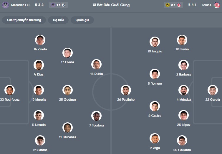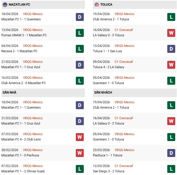 - Trên sân nhà, Mazatlan thắng 3, thua 2 trước Toluca.
