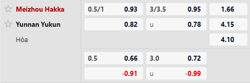 Meizhou Hakka được xếp ở cửa trên trận này với mức kèo 3/4 bàn. Meizhou Hakka và Yunnan Yukun thời gian gần đây chơi tệ như nhau. Tuy nhiên, Meizhou Hakka là đội có mục tiêu rõ ràng hơn trong những vòng đấu còn lại nên khả năng thắng trận cũng cao hơn. Chọn Meizhou Hakka.