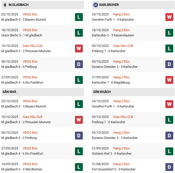 - M'gladbach thắng 1, hòa 1 trong 2 trận gặp Karlsruher gần đây.
