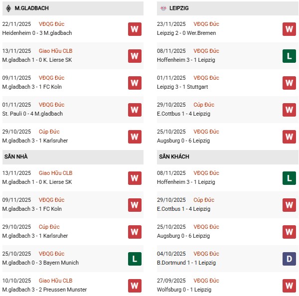 - Trên sân nhà, M'Gladbach thắng 4, thua 5 trước Leipzig.