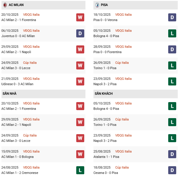 Milan có lý do để tự tin sẽ đánh bại Pisa để tiếp tục trụ vững ở ngôi đầu bảng xếp hạng. Đây là trận đấu mà họ có lợi thế được thi đấu trên sân nhà. Yếu tố này rất quan trọng. Bởi theo thống kê, đội bóng áo sọc đỏ đen đang chơi khá tốt tại San Siro. Cụ thể, họ thắng 5/6 lần tiếp đón các đối thủ gần đây tại sào huyệt của mình.