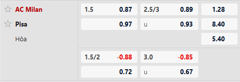 Milan hiển nhiên được đánh giá cao hơn hẳn với kèo chấp 1 1/2 bàn. Không bất ngờ nếu như Milan sẽ giành trọn vẹn 3 điểm ở trận đấu sắp tới trước Pisa để tiếp tục đứng ngôi số 1 tại Serie A. Thậm chí, đội bóng của HLV Max Allegri có thể thắng với cách biệt từ 2 bàn trở lên.