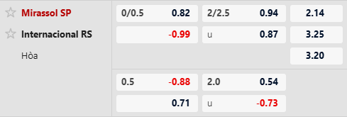 Hàng công Mirassol đang chơi xuất sắc mùa này khi đã ghi đến 44 bàn, thống kê chỉ kém duy nhất Flamengo. Trái lại, hàng phòng ngự đội khách Internacional thực sự gặp khủng hoảng với 38 lần phải vào lưới nhặt bóng. Màn tái đấu này hứa hẹn sẽ hấp dẫn hơn nhiều khi Mirassol đang rất sẵn sàng thắng đậm. Tỷ lệ tài xỉu 2 1/4 cũng là nhẹ nhàng và phù hợp dành cho sự xuất hiện của kèo Tài.