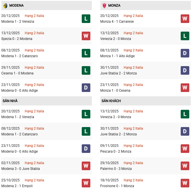 Cả Modena lẫn Monza đều nhận tổng cộng 13 bàn thua, ít nhất Serie B 2025/26 sau 17 vòng. Điểm thú vị là đôi bên cũng giống hệt nhau về số bàn thắng: 25 - con số không thấp so với mặt bằng chung của giải đấu. Tuy nhiên Modena như đã đề cập đang xuống phong độ trong khi Monza chỉ 3 chuyến hành quân mùa này ghi trên 1 bàn. 90 phút sắp tới có lẽ khó hấp dẫn.