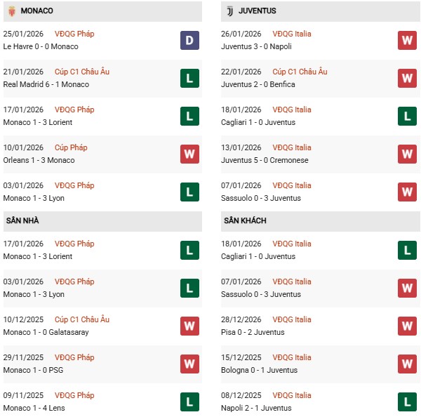 - Trên sân nhà, Monaco hòa 1, thua 1 trước Juventus.