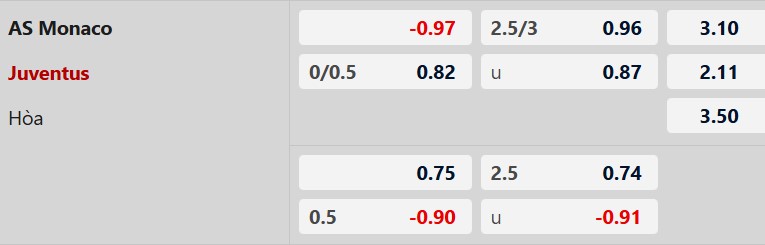 Tối đa 1 bàn hiệp 1: 4/5 lần đối đầu giữa 2 đội gần đây chỉ có nhiều nhất 1 bàn thắng trong hiệp 1. 3/4 trận gần đây của Monaco và 11/12 trận mới nhất của Juve xảy ra tình trạng tương tự.