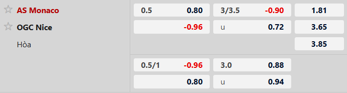 Monaco hiển nhiên được đánh giá cao hơn ở trận này với mức kèo 1/2 bàn. Nice có thể lấn lướt khi đối đầu với Monaco trong 5 trận gần nhất, nhưng phong độ hiện tại, đặc biệt trên sân đối phương của họ lại khiến giới mộ điệu nghi ngờ về khả năng giành điểm tại sân Louis II, nơi chủ nhà quyết tâm bắn hạ Đại bàng nhỏ.