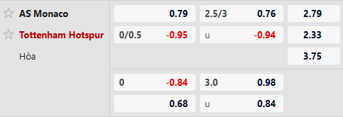 Phải chơi xa nhà nhưng Tottenham vẫn đang được đánh giá nhỉnh hơn đôi chút với tỷ lệ chấp 1/4 bàn. Tuy nhiên, nên nhớ rằng 2 lần gần nhất đụng độ đại diện Pháp ở đấu trường Champions League, Tottenham đã toàn thua. Bất chấp việc Monaco đang chơi khá tệ, khả năng Gà Trống có thể mang về 3 điểm là không nhiều. Với kèo đấu này, rất có thể Monaco sẽ giành được ít nhất 1 điểm và thắng luôn kèo châu Á.