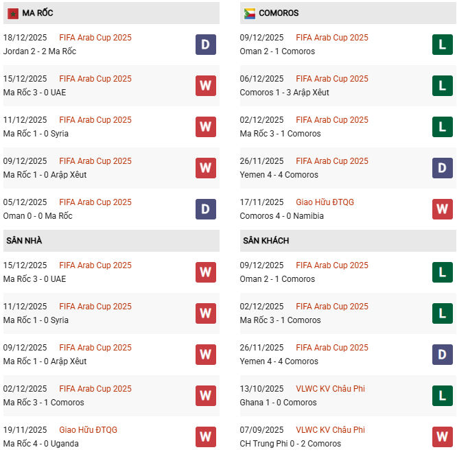Comoros thua cả hai hiệp đấu: Những số liệu thống kê gần đây của Comoros cho thấy một bức tranh khá ảm đạm. Họ không thắng ở 9/10 trận gần nhất trên mọi đấu trường và đã phải chịu 3 thất bại liên tiếp, trong đó họ đều thua cả hiệp một lẫn cả trận đấu. 2 trận đối đầu gần nhất cũng chứng kiến Comoros nhận trái đắng trước Morocco trong cả 2 hiệp đấu.
