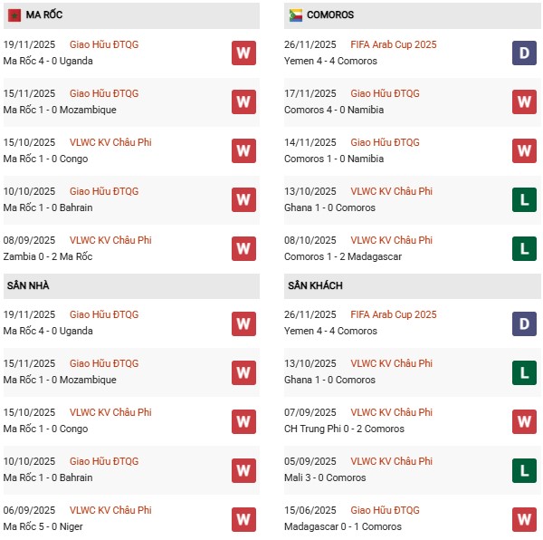 Trong khi đó, Comoros lại cho thấy sự thất thường khi gặp các đội mạnh. Lối chơi phòng ngự, phản công của họ đôi lúc tạo được đột biến, nhưng nhìn chung Comoros vẫn thiếu sự sắc bén trong tấn công và chưa đủ chắc chắn ở hàng thủ. Việc phải đối mặt với một Morocco sở hữu thể lực, kỹ thuật và nhịp độ thi đấu cao sẽ là thách thức lớn.