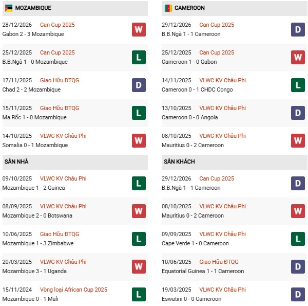 - Mozambique toàn thua cả 4 trận đối đầu Cameroon gần đây.