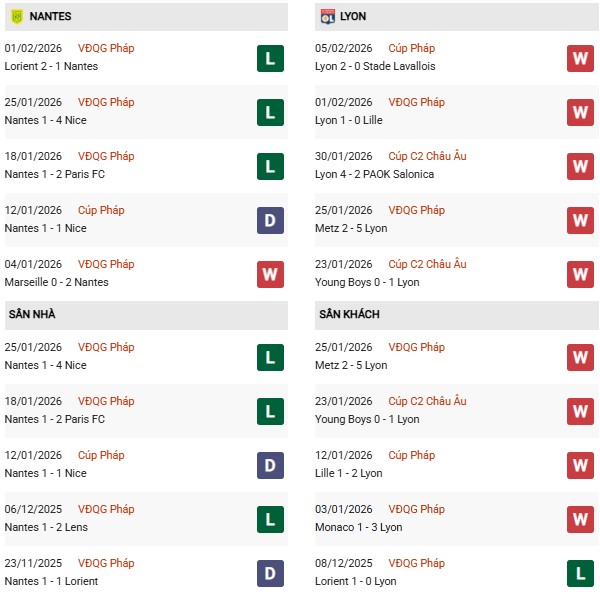 - Trên sân nhà, Nantes thắng 2, thua 5 trước Lyon.