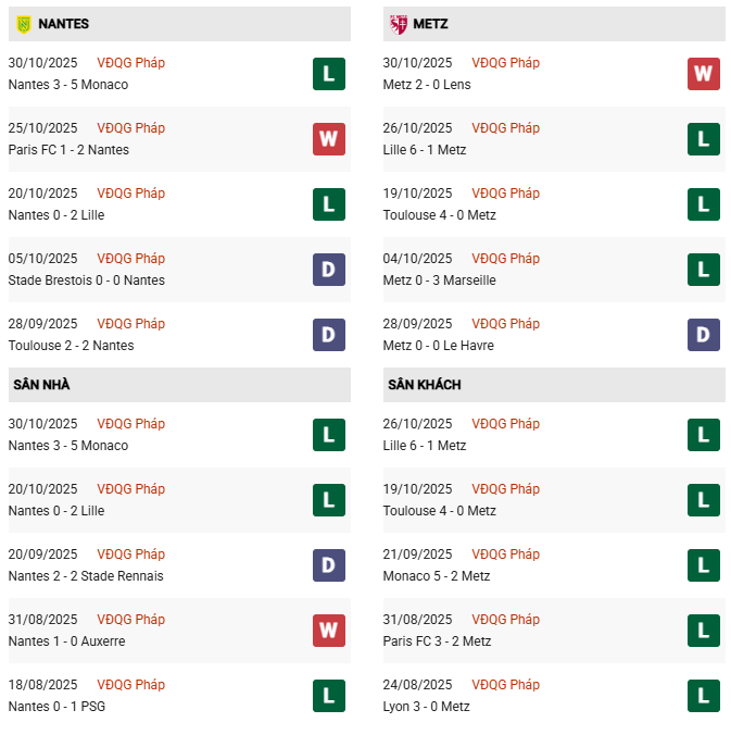 Phía đối diện, Metz để thủng lưới 26 bàn và có 8 bàn thắng sau 10 trận. Những chuyến làm khách của họ gần đây thường là “bữa tiệc bàn thắng” cho đối thủ: 6 bàn thua trước Lille, 4 trước Toulouse, 5 trước Monaco. Đó là con số cho thấy sự thiếu kết nối giữa tuyến giữa và hàng thủ. Khi gặp Nantes – đội có xu hướng chơi tấn công cởi mở trên sân nhà – khả năng cao kịch bản tương tự sẽ tái diễn.