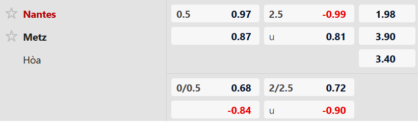 Kèo tài xỉu của trận đấu được niêm yết ở mức 2 1/2, con số phản ánh đúng bản chất đối lập: Nantes có hàng công khởi sắc nhưng phòng ngự thiếu chắc chắn, còn Metz lại phòng thủ tệ nhưng đôi khi biết cách phản công.