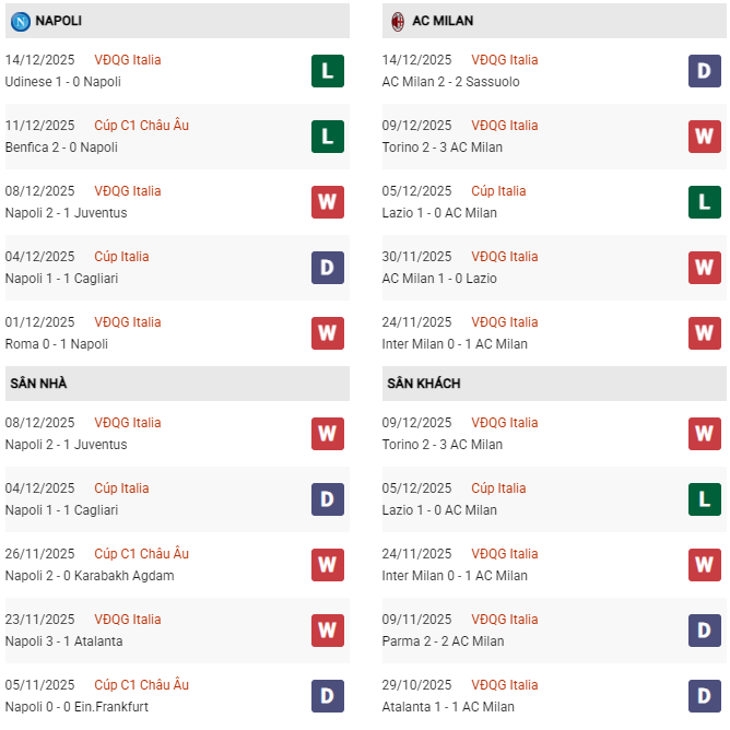 - 10 lần gần nhất đối đầu nhau, Napoli thắng 3 thua 5 và hòa 2 trước Milan.