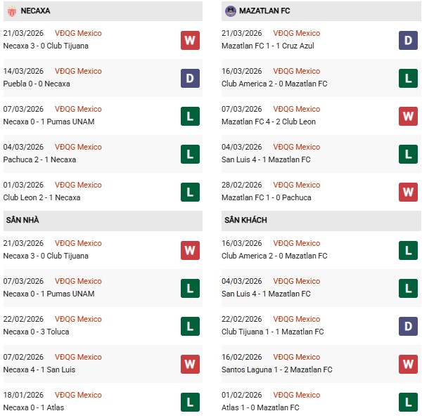 - Necaxa thắng 4, hòa 4, thua 2 trong 10 trận gặp Mazatlan gần đây.