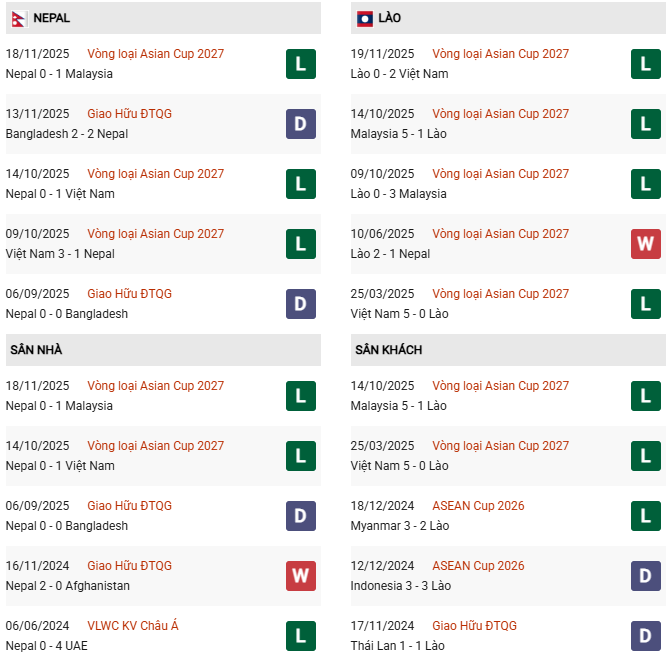 - Nepal thắng 3, hòa 3, thua 1 trong 7 trận gặp Lào gần đây.