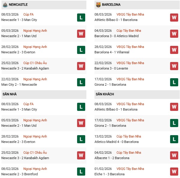 - Newcastle toàn thua cả 4 trận đối đầu Barcelona gần đây.