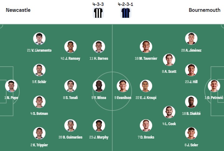 Bournemouth: Kluivert, Doak, Adams, Christie, Dennis, Akinmboni chấn thương.