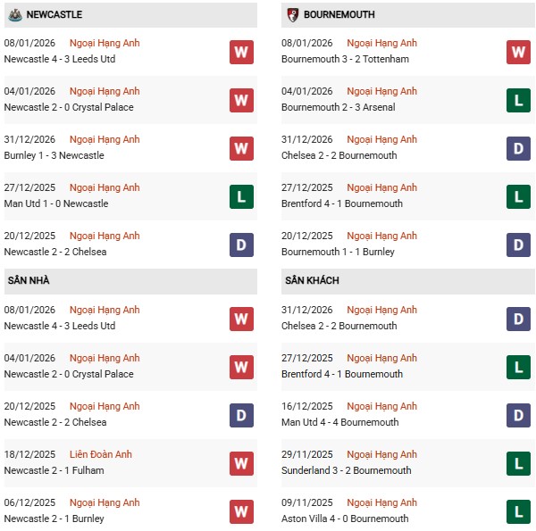 Lịch sử đối đầu đang phần nào ủng hộ Bournemouth. Trong 6 lần chạm trán gần nhất kể từ tháng 2/2023, Newcastle chưa từng giành chiến thắng, trong khi Bournemouth có 2 lần ca khúc khải hoàn và hai đội hòa nhau 4 trận. Dựa trên phong độ hiện tại và tính chất của một trận đấu cúp, nhiều khả năng đây sẽ là cuộc so tài giằng co, nhưng lợi thế sân nhà cùng bản lĩnh ở thời khắc quyết định có thể sẽ giúp “Chích chòe” tạo ra khác biệt.