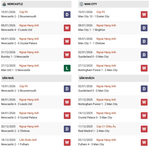 Lịch sử đối đầu gần đây giữa hai đội cho thấy sự cân bằng đáng kể, đều này cho thấy Newcastle hoàn toàn có khả năng gây khó khăn cho Man City, đặc biệt khi họ tận dụng tốt các tình huống phản công và cơ hội ít ỏi. Với phong độ tấn công ấn tượng, Newcastle nhiều khả năng sẽ có bàn thắng vào lưới Man City. Tuy nhiên, xét về bản lĩnh, chiều sâu đội hình và kinh nghiệm ở những trận cầu lớn, Man City vẫn được đánh giá nhỉnh hơn ở khả năng giành chiến thắng.